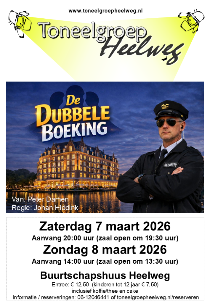 De toneelgroep viert het 50 jarig jubileum met een receptie op zaterdagmiddag 21 februari, in ’t Buurtschapshuus in Heelweg. Daar is gelegenheid om herinneringen op te halen, aan de hand van een kleine tentoonstelling van foto’s, krantenknipsels, programmaboekjes en toneelboekjes. Op het grote scherm zal een foto presentatie te zien zijn. Op zaterdagavond 7 en zondagmiddag 8 maart zijn de opvoeringen van ‘De dubbele boeking’, een blijspel geschreven door Peter Damen. Het vertelt het verhaal van een stel dat in een hotel een mooie suite boekt, om hun relatie een boost te geven. Zij merken echter dat de suite ook door iemand anders is geboekt. Het wordt een hele puzzel om tot een goede oplossing te komen. De groep zal bij deze opvoeringen voor het eerst gebruik maken van geluidsversterking door headsets, wat de verstaanbaarheid ten goede zal komen. Er kan weer gereserveerd worden. Volg de informatie via deze website en via Facebook.